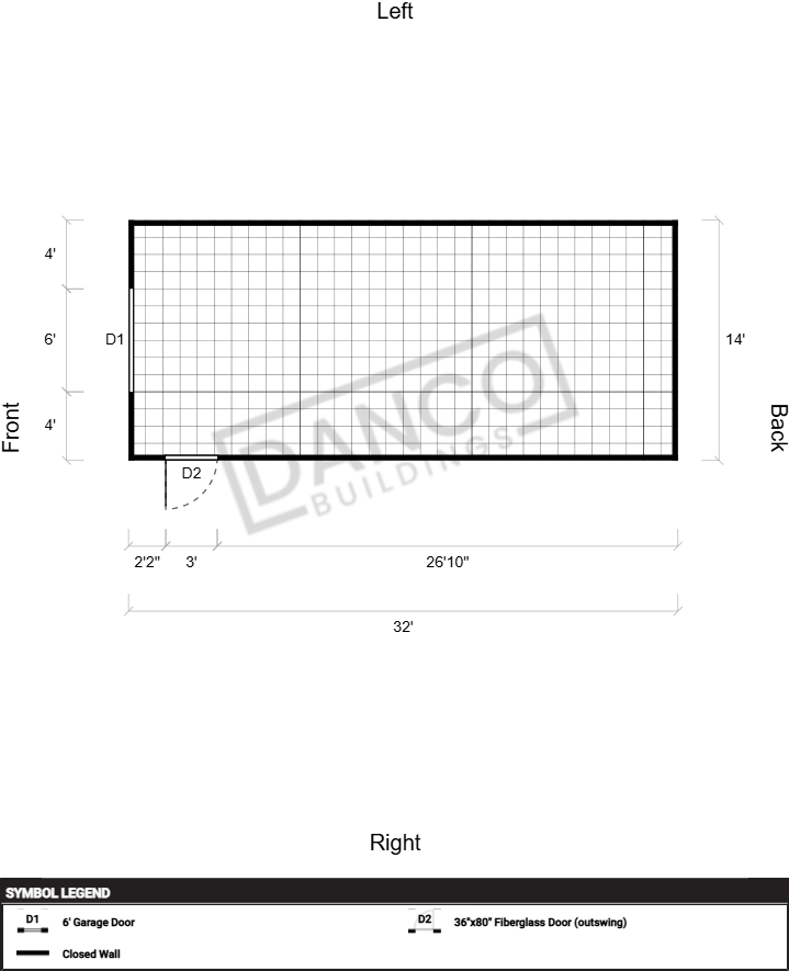 | Doors | 6' Garage Door, 36"x80" Fiberglass Door (outswing), Hinges Left |