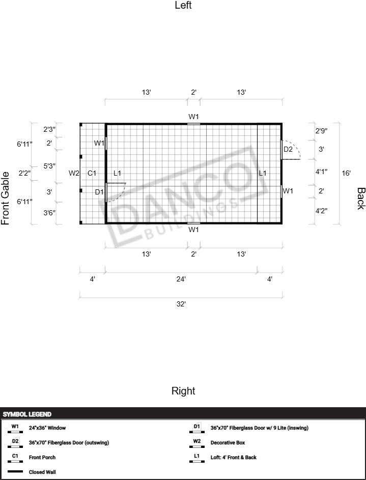 | Doors | 36"x70" Fiberglass Door (outswing), Hinges Left, 36" Wood Walk-In Door, Hinges Left, 36"x70" Fiberglass Door w/ 9 Lite (inswing), Hinges Left |