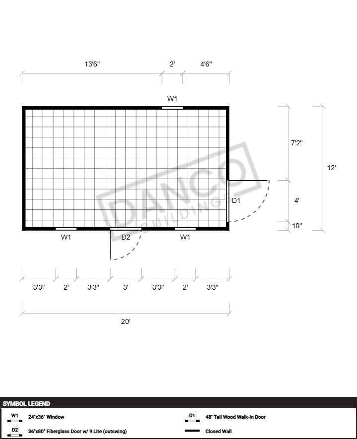 | Doors | 48" Tall Wood Walk-In Door, Hinges Right, 36"x80" Fiberglass Door w/ 9 Lite (outswing), Hinges Left |