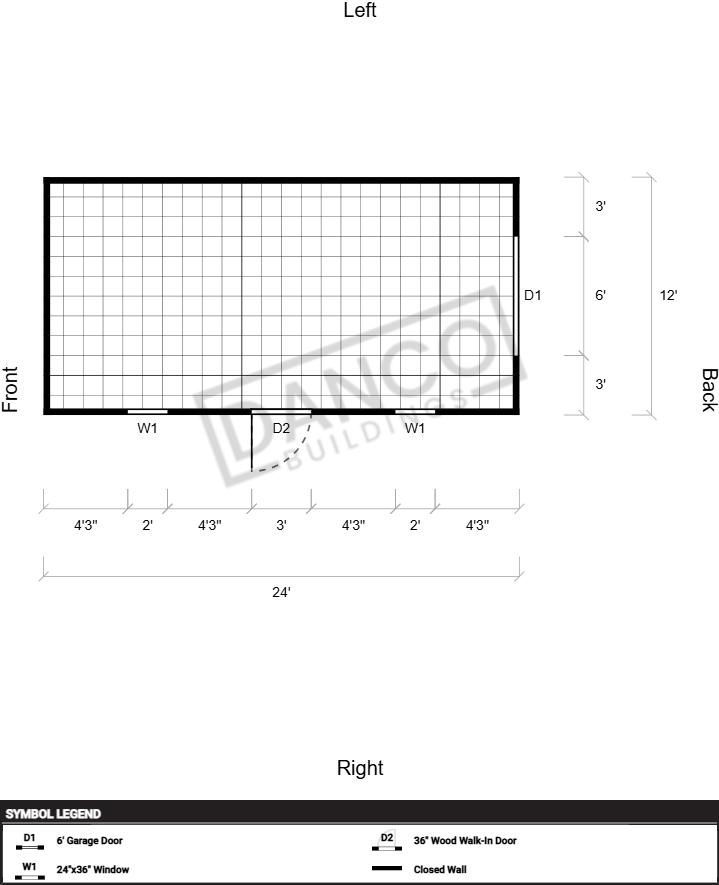 | Doors | 36" Wood Walk-In Door, Hinges Left, 6' Garage Door |