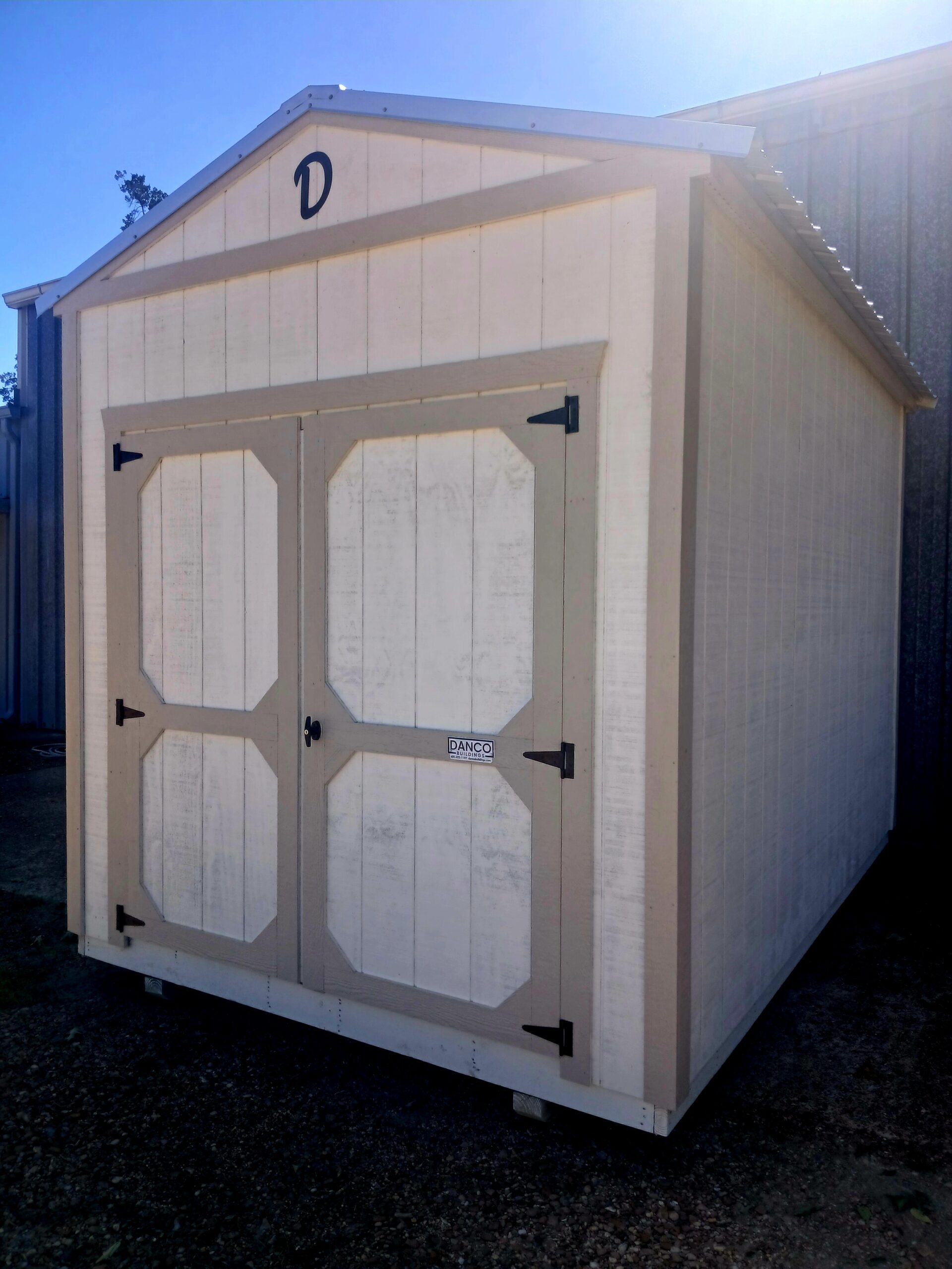 Siding Material: Arauco | Siding Color: Dover White | Siding Material: Arauco | Trim Color: Sandbar | Roof Color: Galvalume | Roof Material: Metal | Doors: 72″ Wood Walk-In Door
